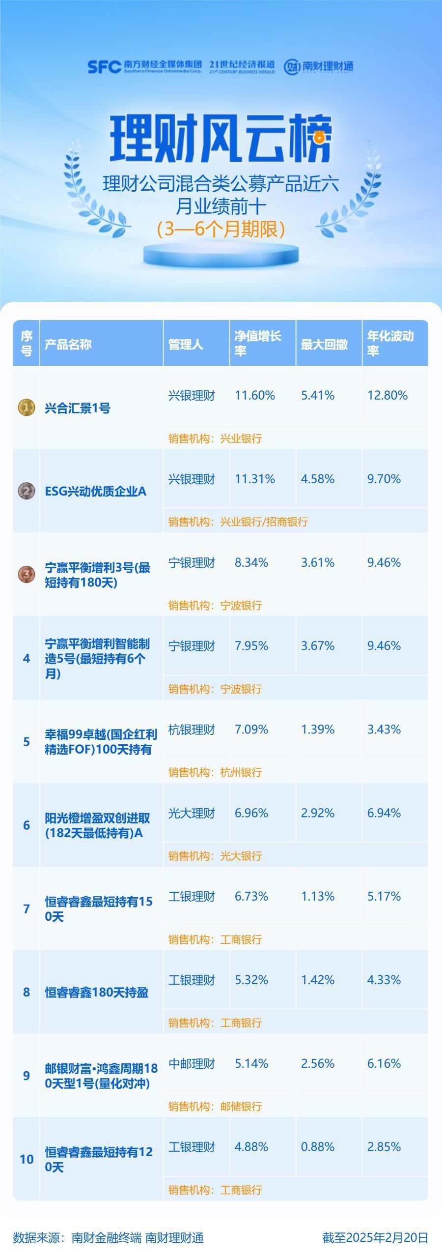 榜单筛选条件:理财公司发行的3~6个月(含)投资周期公募混合类产品,同系列同投资周期产品保留一只。本文榜单排名来自理财通AI全自动化实时排名,如您对数据有疑问,请在文末联系助理进一步核实。